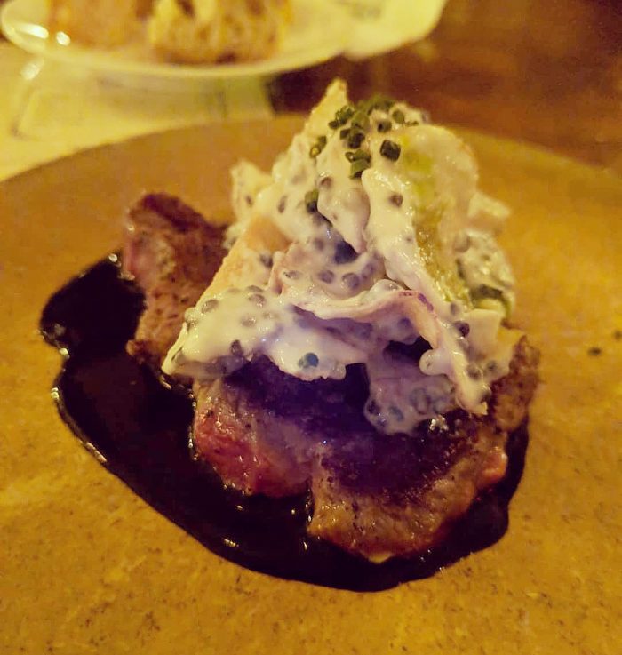 I was in a bit of a surf and turf mood on this night, so for my next course I gave their new “bistec” small plate a try. This dish involves squid ink–which was NOT indicated on the menu, by the way. (I asked the bartender about the dish and he described it to me in detail, including the squid ink.) I don’t like squid ink. I never have. But I decided to overcome that aversion on this night and just go for it. The “bistec” small plate always involves some cut of beef. Most recently, it had been brisket. This new dish, however, was center-cut ribeye served with crispy potatoes (like chips), horseradish creme-fraiche, caviar, and a squid ink & bone marrow sauce. Every bite of this dish tasted like Gatsby-era decadence. You’re damn right I enjoyed it. What better time for decadence than vacation? The combination of bone marrow and squid ink made the squid ink enjoyable for me for the first time in my life. Even though this dish was a small plate, it still took me more than 20 minutes to get through it. Each bite was so full of flavor (and the steak cooked to perfection) that I necessarily took breaks in order to survive the decadence.